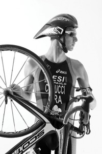 Entre a saída da água e a T1, havia uma distância relativamente longa com uma inclinação bastante acentuada, por isso procurei correr compassadamente os primeiros metros para aos poucos ir sentindo a subida e aumentar o ritmo. Fui bem feliz com essa estratégia e acabei subindo na bike em melhores condições do que a maioria dos outros atletas. Procurei então imprimir um ritmo rápido desde o início do ciclismo e com isso apenas o meu companheiro da equipe SESI/SP, Marcus Fernandes e outro atleta, Rafael Fonseca, ficaram comigo.
