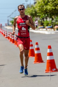 A roupa de borracha foi liberada para todas as categorias e por isso, sem dúvidas, a natação foi num ritmo muito rápido. Eu consegui me posicionar bem a frente do grupo dentro da água e cheguei a primeira transição em segundo lugar. Logo na primeira das seis voltas de ciclismo, estávamos apenas em três atletas pedalando na liderança, e me acompanhavam, o meu parceiro da equipe SESI/SP, Guto Sorbo, e o atleta olímpico e de Belo Horizonte/MG, Diogo Sclebin.