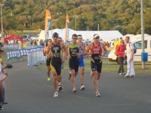 Dessa vez minha natação ainda não foi perfeita, mas pelo menos estava no pelotão dos lideres logo após a T1. Com um percurso super rápido no ciclismo qualquer tentativa de fuga se tornou bastante complicada então adotei uma posição bem defensiva e apenas procurei guardar minhas forças para a corrida. Com uma T2 muito eficiente me coloquei juntos aos primeiros colocados em poucos minutos, ao final da primeira volta estávamos num grupo de cinco atletas apenas com Matt Reed (USA) correndo 20metros a frente do pelotão. Sentia-me muito forte durante a segunda e terceira volta das quatro que deveríamos percorrer, por varias vezes eu fui à frente do pelotão e ditei o ritmo, mas infelizmente não fui capaz de conseguir me desgarrar do grupo que contava com o atual campeão mundial Daniel Unger (GER) e campeão da prova no ano anterior Hendrik de Villers (RSA).