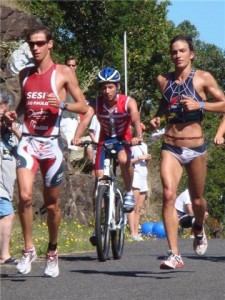 Nos primeiros kms da bike eu ainda não me sentia diferente no entanto com o passar do tempo minhas pernas começaram a responder melhor ao ritmo, nesse pequeno intervalo enquanto tentava colocar minhas pernas pra trabalhar com maior facilidade o argentino pentacampeão da prova Oscar Gallindes me alcançou e como sempre ele estava pedalando muito bem, tive um pouco de dificuldade pra manter o ritmo com ele nos primeiros minutos mas logo após eu já comecei a pedalar melhor. Na segunda metade do ciclismo conseguimos buscar Daniel e pedalamos nos três juntos até a transição para a corrida.