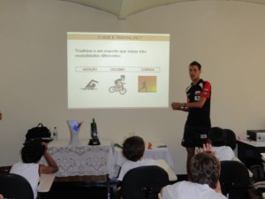 Em um slide show bem simples eu procurei mostrar aos alunos o que é o triathlon e também um pouco de minha história. Em minha opinião deve ter ficado tudo muito legal, pois todos os jovens queriam saber mais e fizeram muitas perguntas ao final da apresentação. Tive que passar um bom tempo autografando os CARDs para os alunos e também fizemos um sorteio de 3 brindes da Asics para eles.